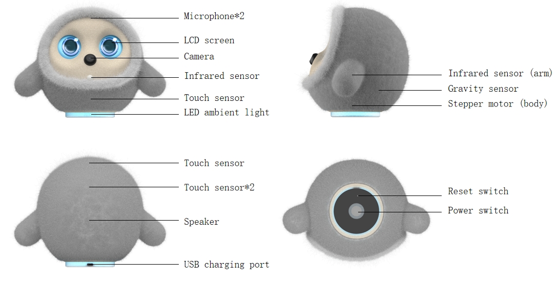 | РК-виразний екран | 4,28-дюймовий РК-екран (очі), підтримує динамічний дисплей і бінокулярний дисплей (наприклад, візуальний зворотний зв’язок, коли «грає мертвим» або «поводиться мило»). |