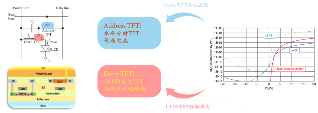 Запровадження компанією Apple технології LTPO у 2018 році поєднало в собі переваги обох, інтегрувавши LTPS та IGZO TFT для забезпечення динамічного регулювання частоти оновлення, значно зменшуючи енергоспоживання екрана. Відтоді це стало фірмовою технологією для AMOLED-дисплеїв високого класу.