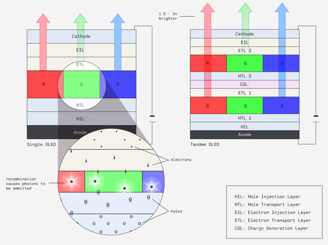 Крім того, багатошарова тандемна структура об’єднує кілька світловипромінюючих блоків через шар генерації заряду (CGL), підвищуючи яскравість і подовжуючи термін служби пристрою. Ці технології призвели до поширених рішень масового виробництва, таких як WOLED і QD-OLED.