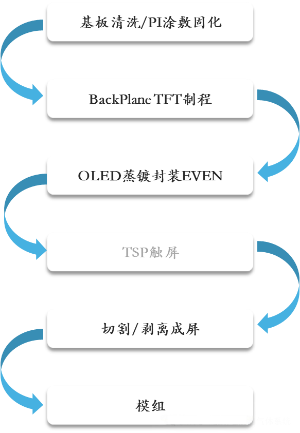 Основний виробничий процес AMOLED включає кілька високотехнічних процесів. У процесі TFT (BP) технологія низькотемпературного полікристалічного кремнію (LTPS) стала основною завдяки своїй високій мобільності електронів. Його структурний процес верхнього затвора включає такі етапи, як осадження буферного шару, імплантація канальних іонів, кристалізація лазерного відпалу (ELA), напилення металу затвора та імплантація витоку-стоку. Спеціальні гази відіграють вирішальну роль у осадженні, модифікації та травленні тонких плівок: наприклад, процеси PECVD використовують SiH₄/N₂O/NH3 для осадження тонких плівок a-Si/SiNx/SiOx; Атомно-шарове осадження (ALD) використовує TMA та H₂O для формування шарів інкапсуляції Al₂O3; Сухе травлення забезпечує високоточне формування візерунків за допомогою газів, таких як CF4/SF6/Cl2, де BCl3 використовується для зменшення шарів оксиду металу, а Cl2 генерує леткі продукти травлення, забезпечуючи чистий та ефективний процес.