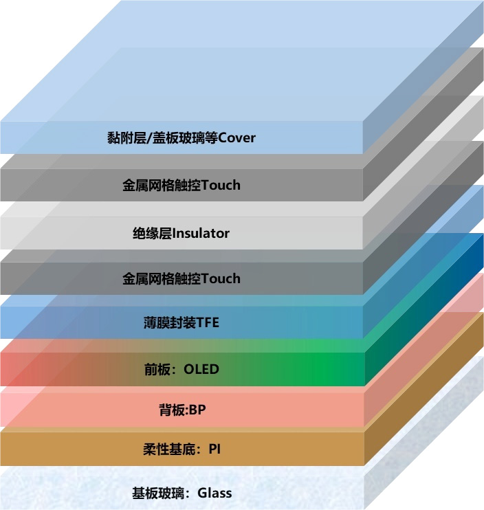 Його основна структура включає світловипромінюючий шар OLED, задню панель TFT, металеві електроди, скло підкладки та корпус.